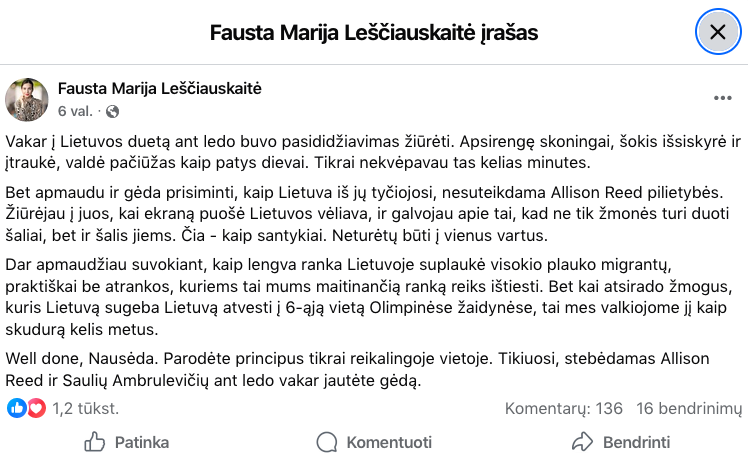 Po nuostabaus Allison Reed ir Sauliaus Ambrulevičiaus pasirodymo ant ledo Milano-Kortinos olimpinėse žaidynėse, Fausta Marija Leščiauskaitė neapsikentė ir socialiniuose tinkluose sukritikavo prezidentą Gitaną Nausėdą.