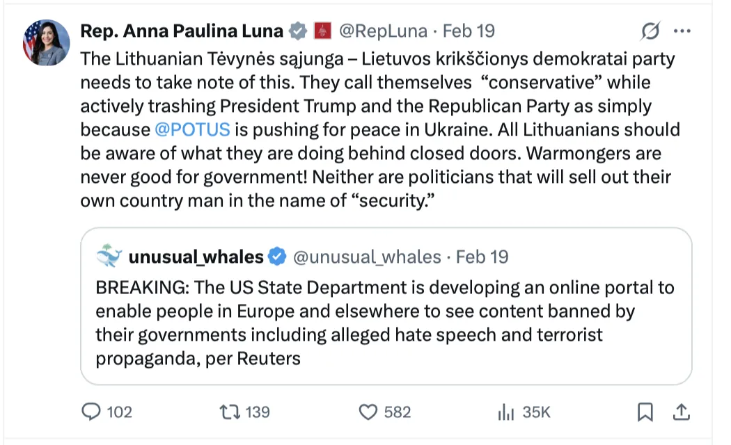 JAV Atstovų Rūmų narė Anna Paulina Luna viešai sukritikavo Lietuvos partiją Tėvynės sąjunga – Lietuvos krikščionys demokratai (TS-LKD). Savo įraše socialiniame tinkle „X“, paskelbtame vasario 19 dieną, ji pareiškė, kad partija, vadinanti save konservatyvia, esą aktyviai menkina prezidentą Donaldą Trumpą.[1]