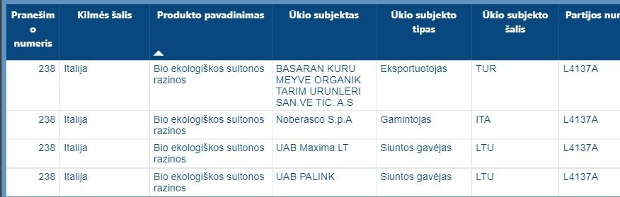 Skubių pranešimų apie nesaugų maistą ir pašarus sistemoje VMVT pranešė apie „Bio ekologiškas sultonos razinas“.