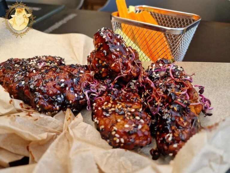 BBQ vištienos sparneliai su sezamu – 9,50 €. Taip pat prie alaus kaip užkandis puikiai tiko vištienos sparneliai, kurie buvo taip puikiai padengti BBQ glazūra, tad papildomai patiekto padažo mums net neprireikė.