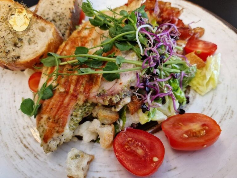 Cezario salotos su grill krevetėmis – 9,90 € / Cezario salotos su grill vištiena – 8,00 € / Cezario salotos su lašiša – 9,90 €. O kai mūsų damoms patiekė „Cezario“ salotas, tai pasigirdo kalbos, kurias dažniausiai kalba moterys matydamos daug skanaus maisto.