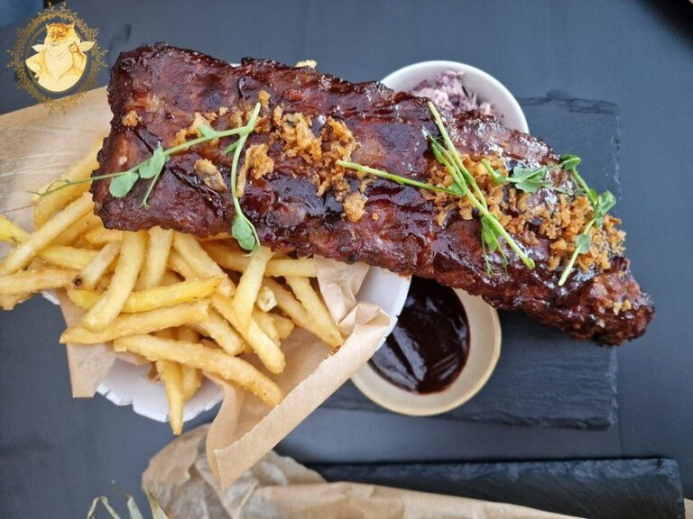 SOUS VIDE juostiniai paršiuko šonkauliai – 16,00 €. Šonkaulius valgydamas net pamiršau prieš tai valgytus užkandžius ir sriubą. Jie buvo tokie skanūs, kad mano lėkštėje liko tik kelios bulvytės ir padažas.