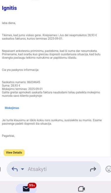 Minėta bendrovė primena, kad kilus įtarimų dėl gautų pranešimų, klientams pirmiausia rekomenduojame tokio pranešimo pagrįstumą pasitikrinti prisijungus prie mano.ignitis.lt savitarnos, kur tiksliai bus galima matyti mokėjimo situaciją arba susisiekus su bendrove internetu – interneto pokalbis yra greičiausias konsultavimo būdas, o neturint galimybės naudotis internetu – pasiskambinti oficialiu bendrovės klientų aptarnavimo numeriu +370 611 21802.