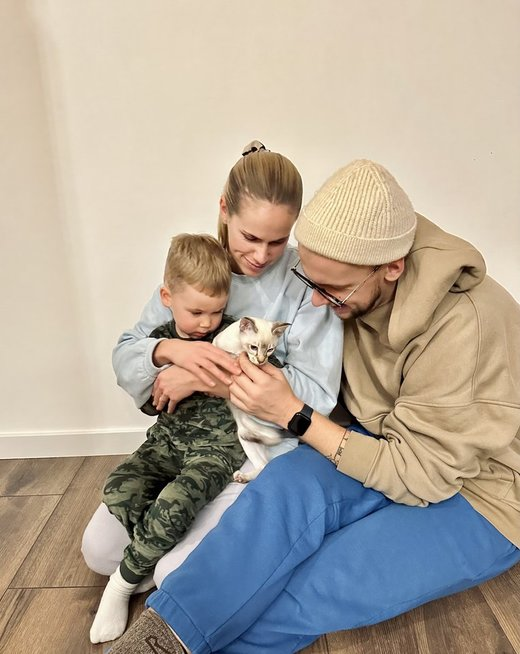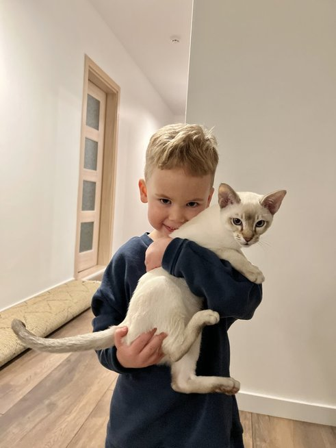 „Vieni geriausių mūsų draugų turi būtent Tonkino veislės katiną. Jų sūnus yra Nojaus bendraamžis, jis puikiai sutaria su katinuku. Kadangi matėme jų draugystę, nusprendėme įsigyti tokį patį augintinį. Tonkinukai – šeimos katinai, mylintys vaikus, visiškai neagresyvūs ir antialergiški. Mums tiek užteko. O išvydę baltą katiną, „išsilydėme“ dar ir dėl jo grožio“, – tikino vyras.