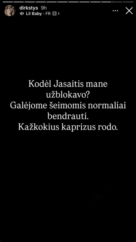 „Kodėl Jasaitis mane užblokavo? Galėjome šeimomis normaliai bendrauti. Kažkokius kaprizus rodo“, – instagrame rašė Dominykas Dirkstys, leisdamas suprasti, kad socialiniame tinkle Simas jį užblokavo.