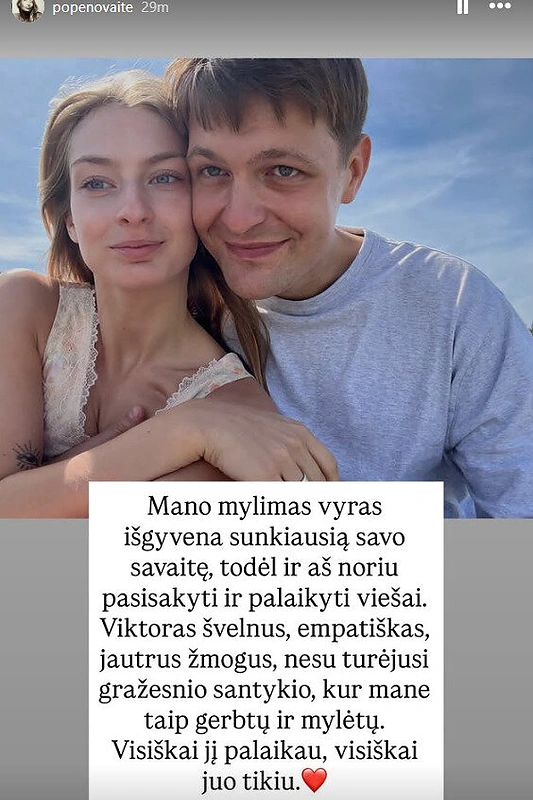 „Mano mylimas vyras išgyvena savo sunkiausią savaitę, todėl ir aš noriu pasisakyti ir palaikyti viešai. Viktoras švelnus, empatiškas, jautrus žmogus, nesu turėjusi gražesnio santykio, kur mane taip gerbtų ir mylėtų. Visiškai jį palaikau, visiškai juo tikiu“, – „Instagram“ žinutėje rašė ji.