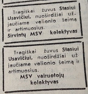 Tiesa, pastarajame laikraštyje Širvintų MSV (melioracijos statybos valdybos) vairuotojų kolektyvas išreiškė užuojautą: „Tragiškai žuvus Stasiui Usavičiui, nuoširdžiai užjaučiame velionio šeimą ir artimuosius“. Būtent S.Usavičius buvo žuvęs vairuotojas.