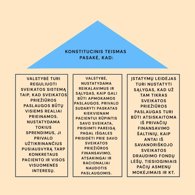 Pradėkime nuo pradžių – mūsų Konstitucijos 53 straipsnio 1 dalis aiškiai numato, kad valstybė rūpinasi žmonių sveikata ir laiduoja medicinos pagalbą bei paslaugas žmogui susirgus, o įstatymas nustato piliečiams nemokamos medicinos pagalbos valstybinėse gydymo įstaigose teikimo tvarką. Atkreipkime dėmesį: nemokama – valstybinėse gydymo įstaigose. Ir šias nuostatas labai nuosekliai daugelį kartų išaiškino Konstitucinis Teismas.