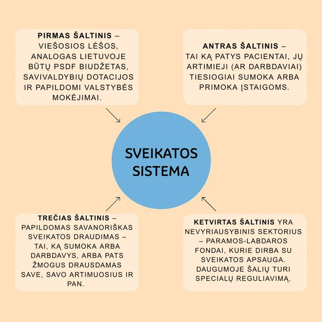 Teisingumo dėlei reikia pripažinti, kad nėra nė vienos valstybės ES, kurioje sveikatos sistema veiktų idealiai, visi turi savo problemų. Tačiau tos valstybės, į kurias esame įpratę žiūrėti ir baksnoti pirštu kaip į gerą pavyzdį – Daniją, Švediją, Suomiją, Vokietiją, Prancūziją, iki tam tikro momento Jungtinę Karalystę, jos visos turi keturis aktyviai ir lygiagrečiai veikiančius sveikatos sistemos finansavimo šaltinius, stebi bendrą finansų srautą savo sveikatos sistemoje.