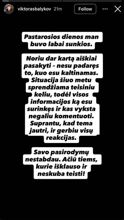 „Noriu dar kartą aiškiai pasakyti – nesu padaręs to, kuo esu kaltinamas. Situacija šiuo metu sprendžiama teisiniu keliu, todėl visos turimos informacijos ir vykstančių procesų negaliu komentuoti. Suprantu, kad ši tema yra jautri, ir gerbiu visų žmonių reakcijas.