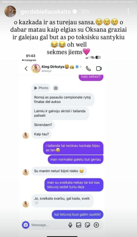 Viešojoje erdvėje netylant kalboms apie Oksana Pikul ir Dominykas Dirkstys santykius, netikėtai prabilo nuomonės formuotoja Gerda Bieliauskaitė. Ji nusprendė paviešinti asmeninį susirašinėjimą su kovotoju.